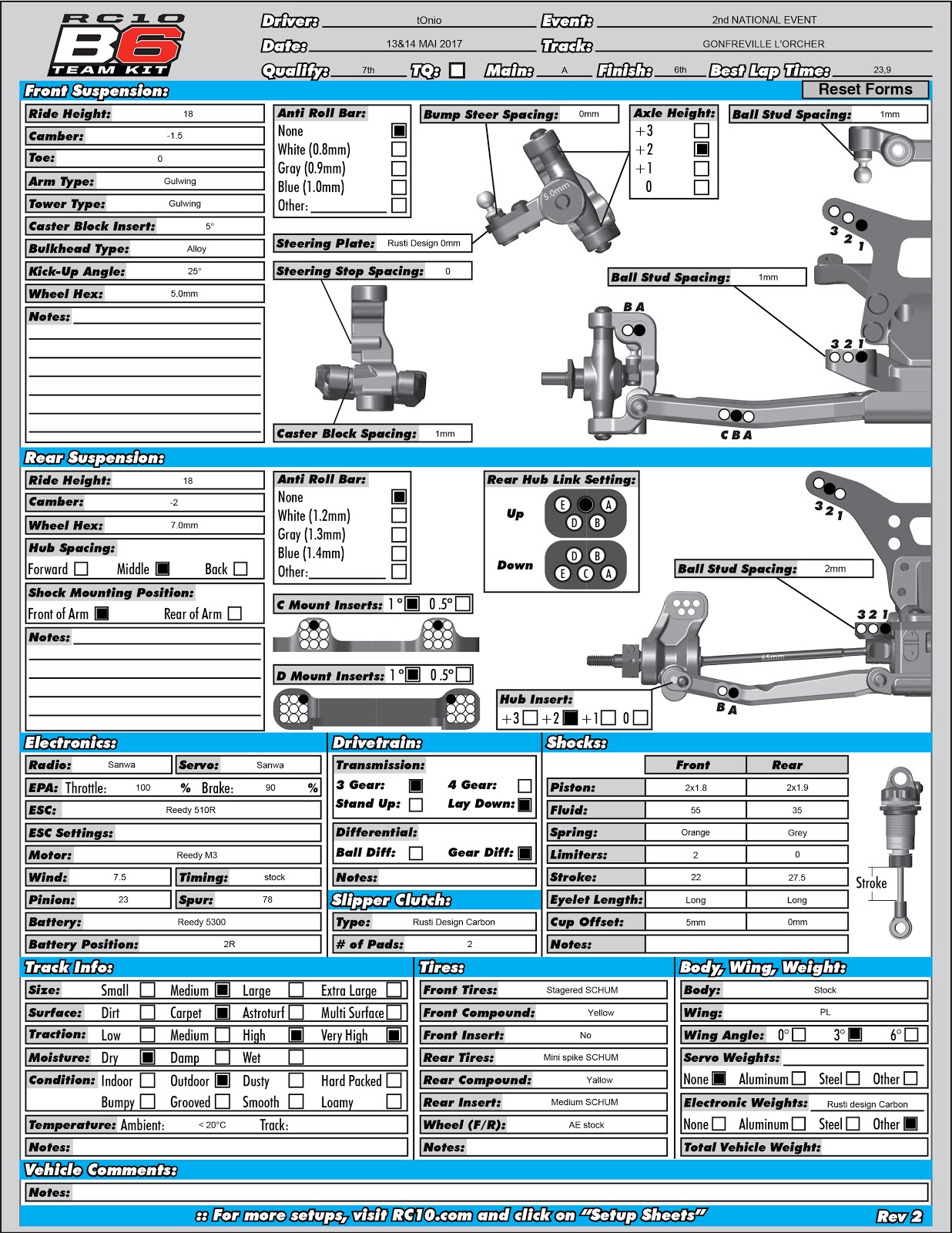 Voici quelques photos ainsi que mes fiches de setup utilisées pour la course régionale de Reims du 25 Juin 2016.
